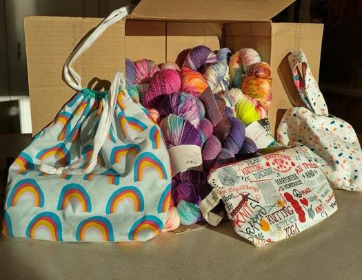 The box from Katie with project bags and yarns and all kinds of fun things