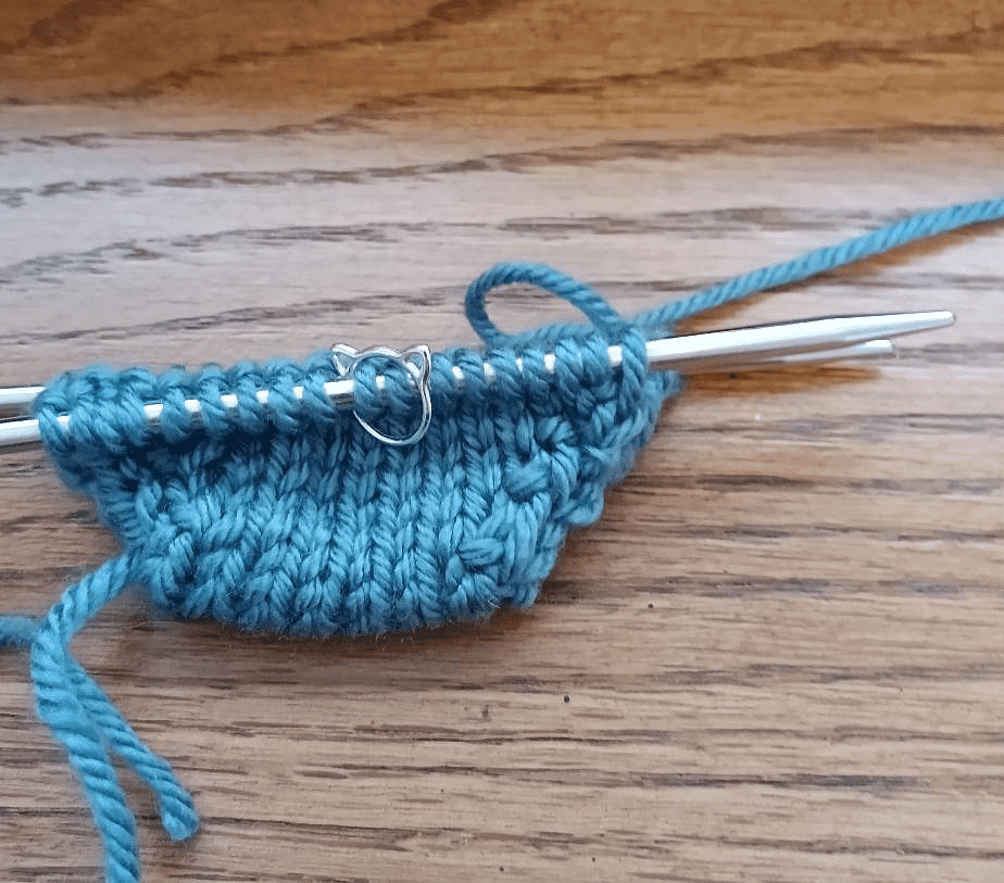 After a long restorative nap following a visit to a local yarn truck (a subject for another blog!), I picked up the size 5 needles and smooth worsted-weight yarn and did my 10th—or was it 12th?—magic cast-on, placed the cute little cat marker you see in the picture below, and started really focusing on mastering “Magic Loop knitting.”